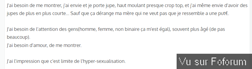 J'ai besoin de me montrer, j'ai envie et je porte jupe, haut moulant presque crop top, et j'ai même envie d'avoir des jupes de plus en plus courte... Sauf que ça dérange ma mère qui ne veut pas que je ressemble a une put€.